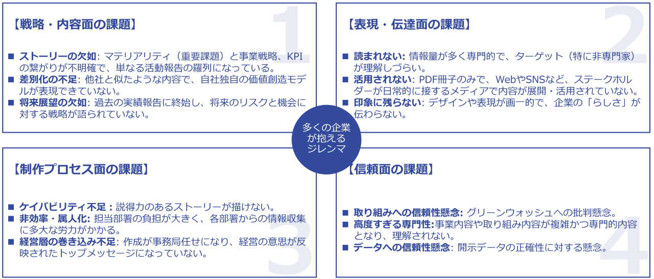 開示要請が高まる一方で、実際にはストーリーの弱さ、表現の画一化、制作負荷の大きさ、データへの信頼性懸念などにより、“作っただけで終わる”統合報告書も少なくありません。いま求められているのは、ファクトに基づき、読み手に届く開示への転換です。