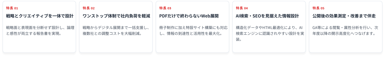 財務・非財務を統合した価値創造ストーリーを論理的に構築し、読み手の心に響くデザインとデジタル施策へ昇華。「正しいこと」を「伝わるかたち」に変換し、企業価値評価の向上を多角的に支援します。
