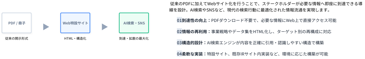期待する読み手に情報を「届ける」ための構造設計を、PDF中心の開示からWeb活用・SEOからAIO(AI最適化)までワンストップで支援します。