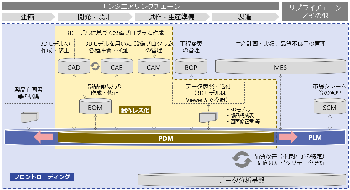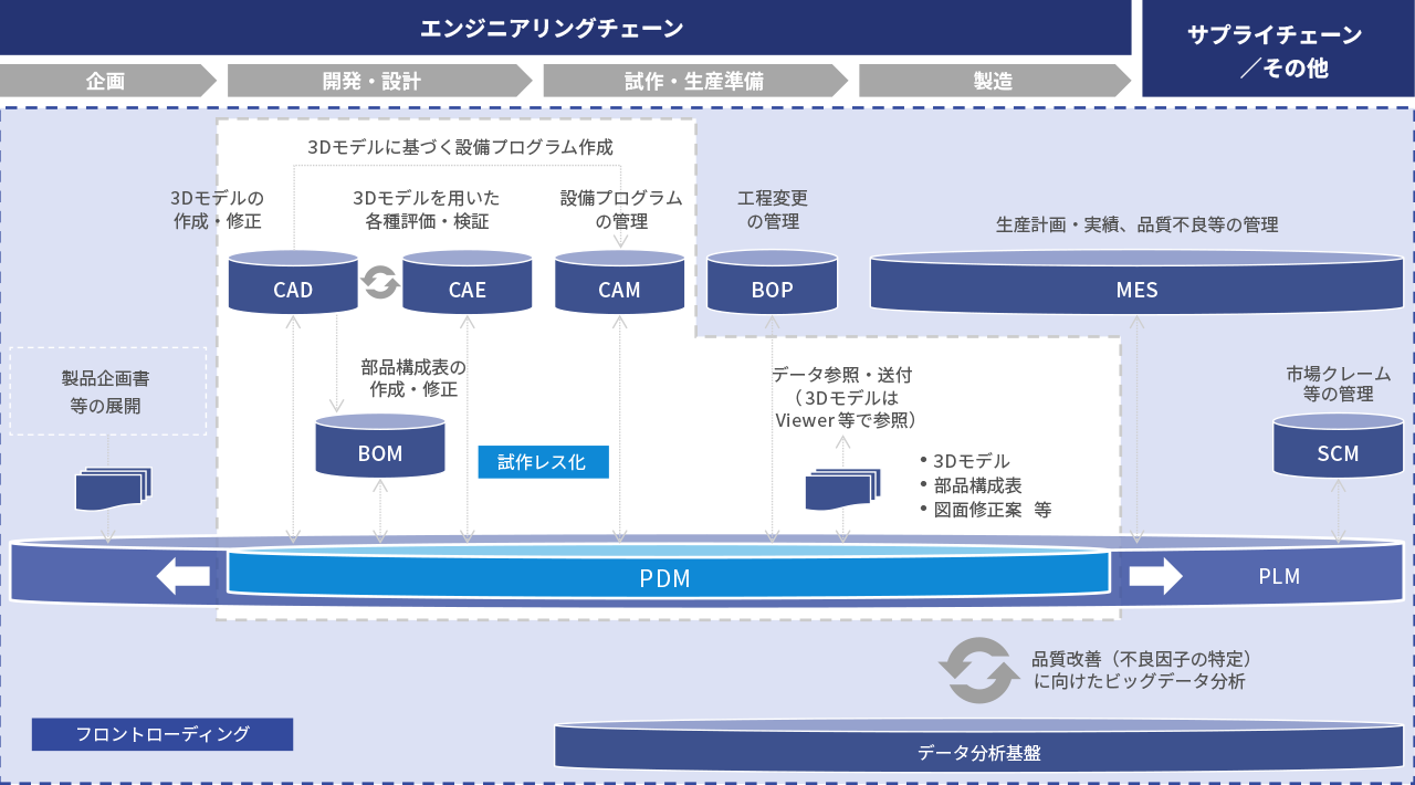 本サービスにおいては、PLM/PDMの本来的な活用に向けた方針策定を通じて、将来開発プロセスにおける試作レス化やフロントローディングの実現を支援します。
