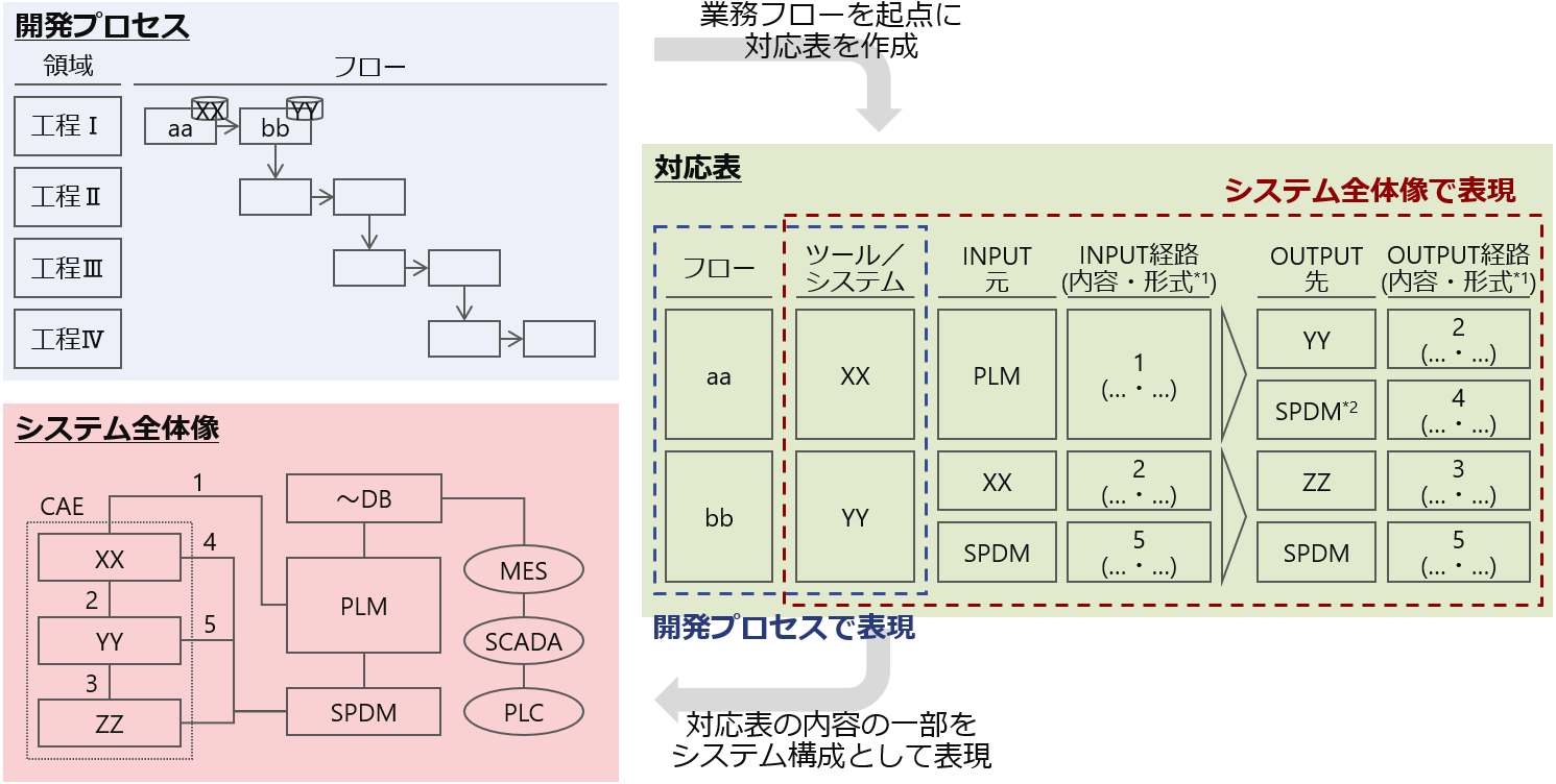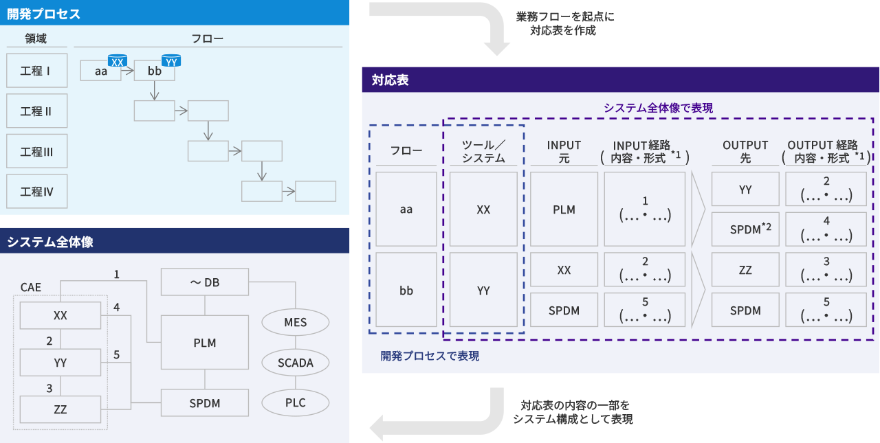 本サービスにおいては、製造業での実務経験を有するプロフェッショナルが、将来の開発プロセスおよびシステム全体像を可視化し、その上で開発プロセス中の各業務におけるINPUT/OUTPUTデータやそれらのデータ流通経路、データ形式などを対応表という形で整理することで、PLM/PDMのデータ連携基盤としての活用方針を策定します。