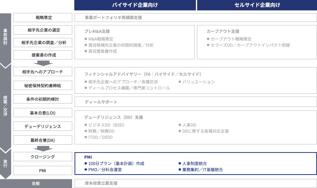 | 金融 | 買収企業のPMI | 買収企業のPMIに向けた100日プラン作成、プランに基づく各施策の実行を支援 |