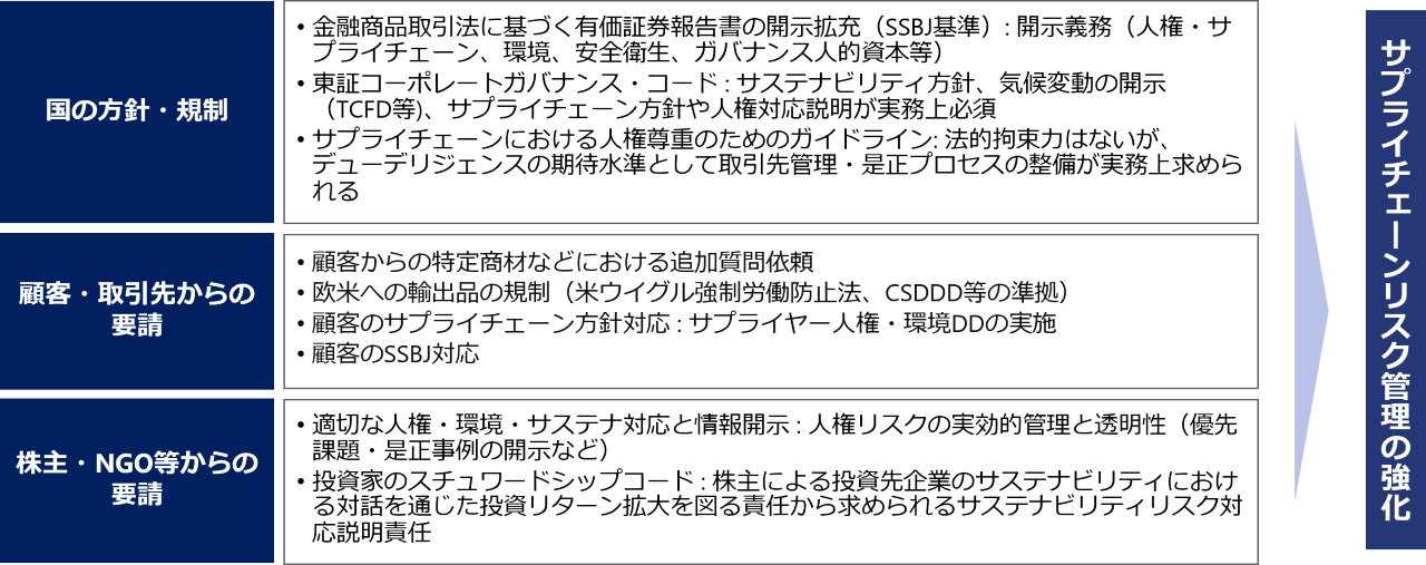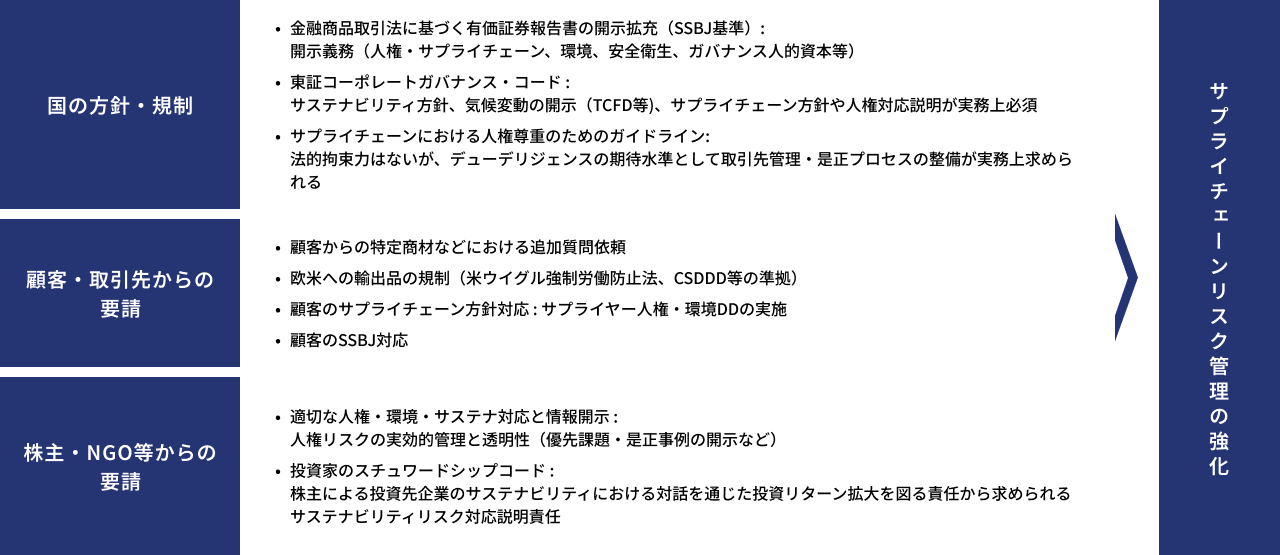 国の方針・規制の新たな制定や、顧客・株主などのステークホルダーによる人権や環境に関する開示要請、欧米の輸出規制や人権・環境のデューデリジェンス実施義務などの企業に対するプレッシャーは近年益々増加傾向にあります。それに対応するため、サプライチェーンリスク管理の強化の重要性が高まっています。