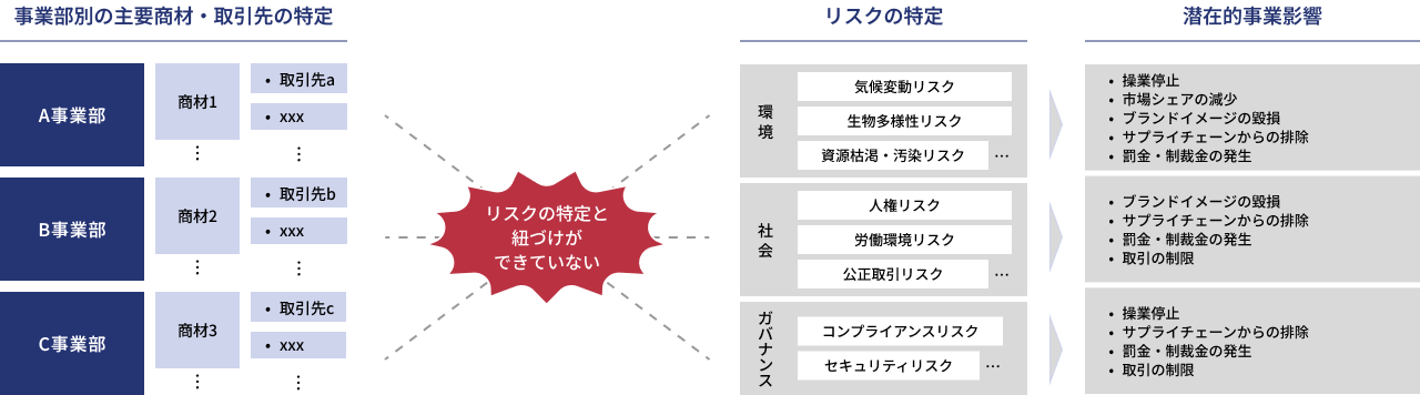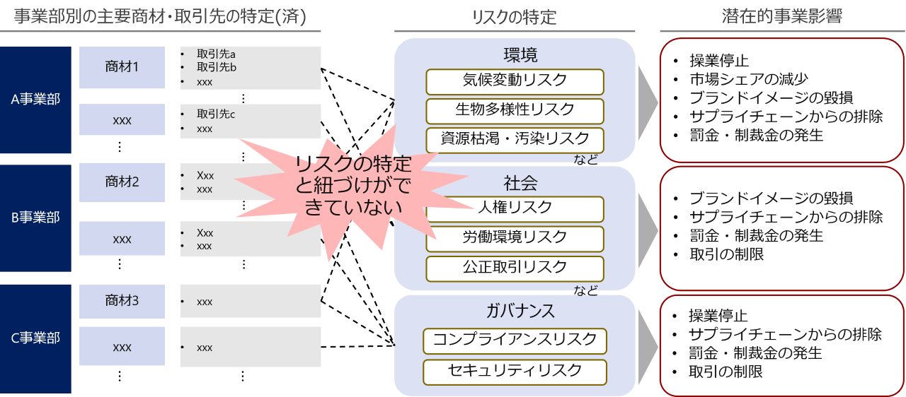 自社事業の商材・取引先とリスクの特定と紐づけができなければ、潜在的事業影響が顕在化してしまう恐れがあります。