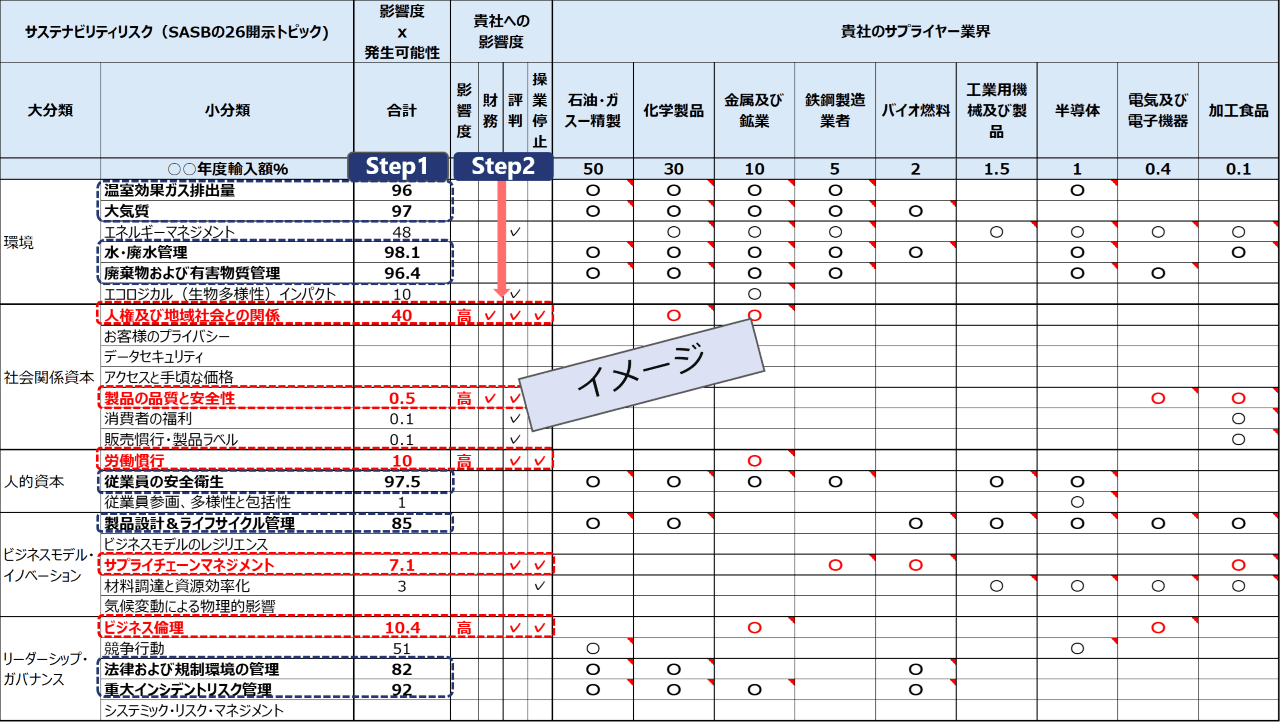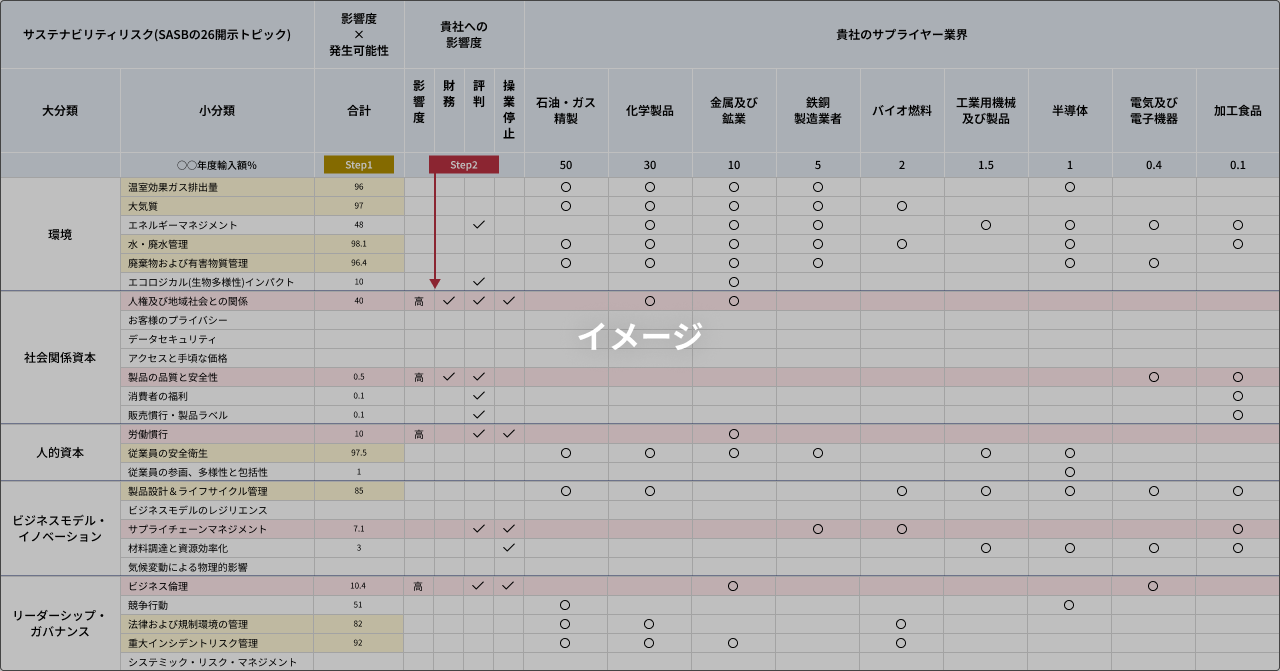 サプライヤー業種ごとにSASBスタンダードで紐づけられているサステナビリティリスクをマッピングし、優先順位付けとして、①取扱商材量等発生可能性の高いリスク、②財務/評判/操業停止で影響が高いリスクの特定を行います。