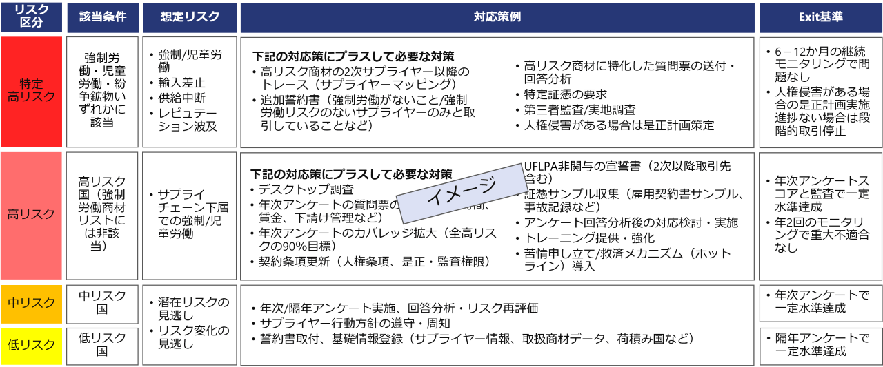 評価結果に基づき、サプライヤーをそれぞれのリスク区分に分類し、リスク区分別の対応策を提案し、実施支援をします。